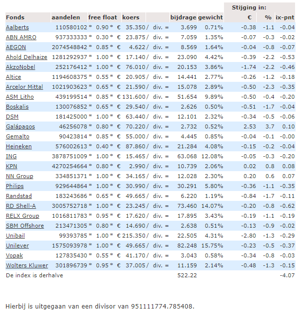 De index wordt elk jaar in februari opnieuw samengesteld. Er wordt dan gekeken naar de 25 bedrijven die de grootste ‘marktkapitalisatie’ hebben, de maximale weging is dan echter 15%. Onderstaande tabel geeft de weging van de AEX-index weer. Voor de actuele stand van zaken verwijzen wij u naar: http://www.behr.nl/koersen/indices