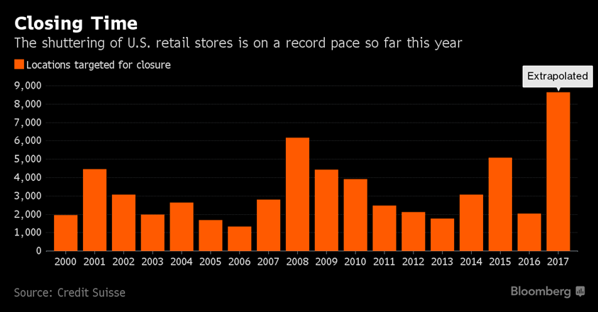 Tot dusverre ligt het aantal winkelsluitingen hoger dan in het rampjaar 2008. Er zijn er tot nu toe 2.880 winkelsluitingen afgekondigd tegen 1.153 in dezelfde periode in 2016. Als deze trend doorgetrokken wordt, dan gaat het in 2017 in totaal om 8.640 winkelsluitingen tegen 6.200 in 2008. Ingewijden zijn ook somber over de jaren na 2017.