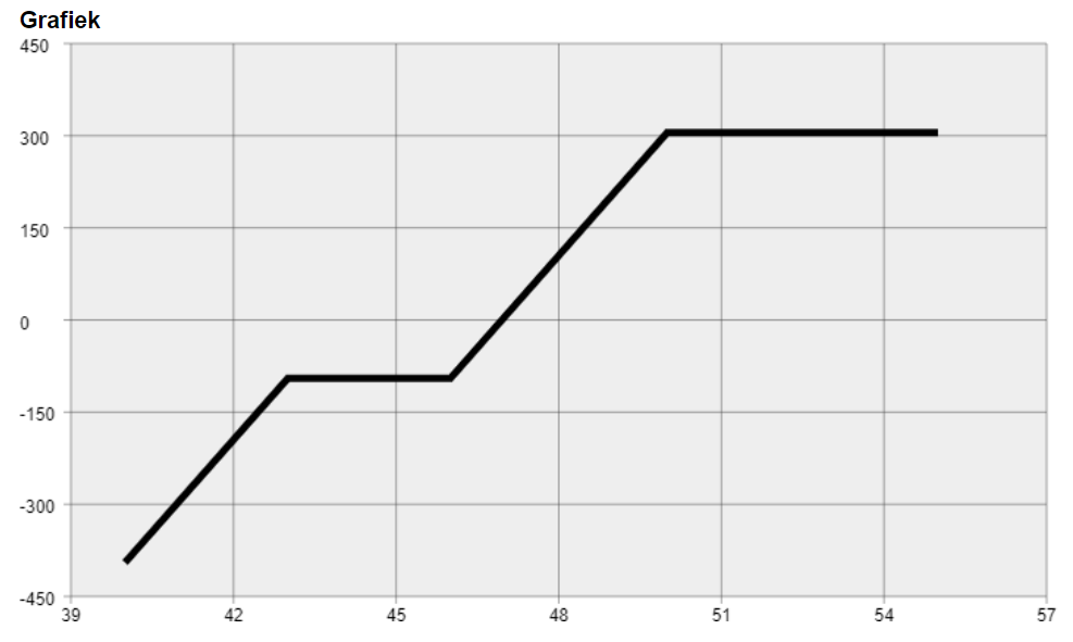De koers moet daarentegen echter niet te ver wegzakken, want een december-expiratiekoers onder de $43 geeft een afnameplicht op op $43 per aandeel. Iedere dollar onder dit niveau levert derhalve een minder resultaat op van $100 per dollar beweging. Break even point is: