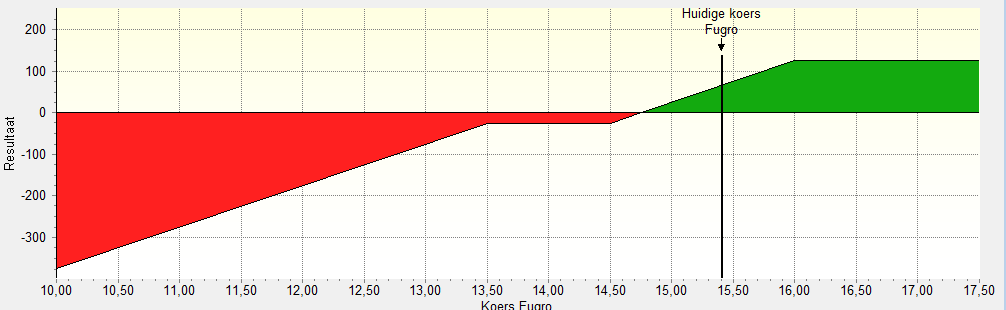 Het risico ligt duidelijk aan de onderkant (vanwege een potentiële afnameplicht) bij een koersdaling onder €13,50. Wij vinden dit risico acceptabel, want rond €14 ligt een stevig steunniveau. Wel is er een margin nodig vanwege de geschreven put.