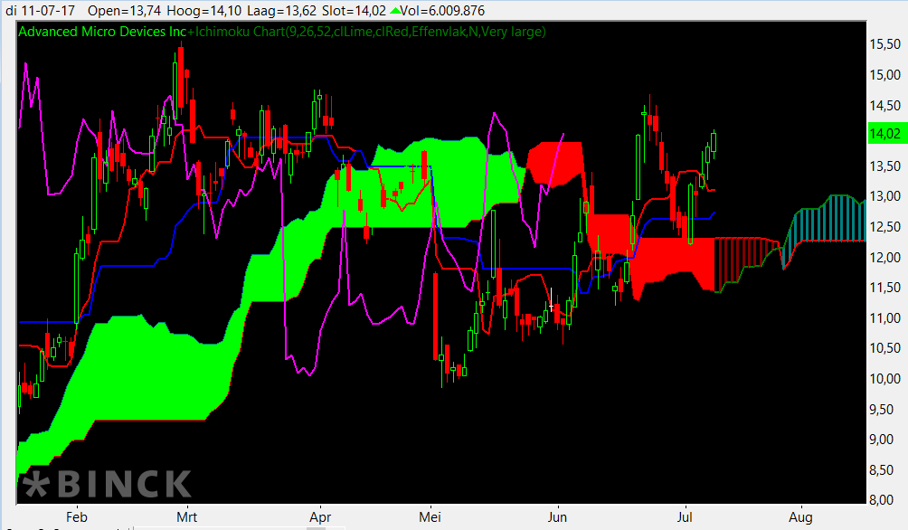 Op bovenstaande daggrafiek is te zien dat AMD sinds februari fors terrein heeft verloren vanaf de high van rond $15,50 tot $10 in mei. Momenteel noteert het aandeel boven de rode Ichimoku Cloud (hier de rode wolk) die steun kan bieden rond de $12,50.