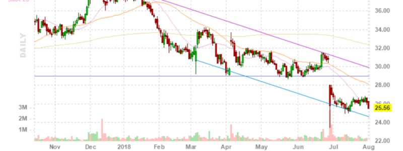 De koers is na de tegenvallende cijfers eind juni hard gedaald tot $24 en is vervolgens weer wat opgeveerd. We verwachten dat de koers boven deze low zal blijven. Er ligt een weerstand rond de $28. We spelen in op een zijwaartse tot licht stijgende markt met een geschreven augustus put. Huidige koers onderliggende waarde: $26,49.